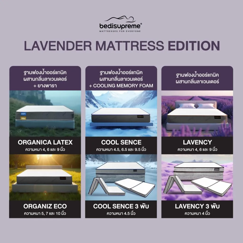 ที่นอนลาเวนเดอร์ BEDISUPREME LAVENDER EDITION เป็นที่นอนกลิ่นลาเวนเดอร์รุ่นพิเศษจากแบรนด์ Bedisupreme ที่พัฒนาขึ้นมาเพื่อมอบการนอนหลับที่มีคุณภาพ จุดเด่นหลักของที่นอนรุ่นนี้คือการใช้ฐานฟองน้ำออร์แกนิคเทคโนโลยีใหม่เป็นวัสดุหลัก ผสานกับสารสกัดลาเวนเดอร์ที่อยู่ในเนื้อวัสดุ ทำให้มีกลิ่นหอมอ่อนละมุนแผ่กระจายอย่างเป็นธรรมชาติตลอดการใช้งาน ช่วยให้ผู้นอนรู้สึกผ่อนคลาย และนอนหลับลึกได้ง่ายขึ้น