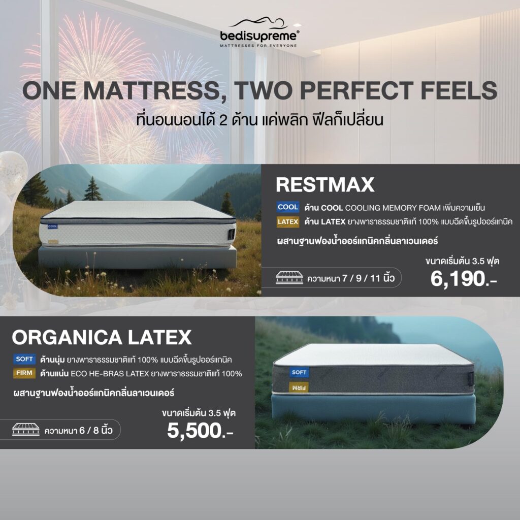 หากคุณมองหาความคุ้มค่า และความยืดหยุ่นในการใช้งาน ที่นอนดีที่ควรมีรับปีใหม่ จาก Bedisupreme ที่นอนได้ 2 ด้านคือตัวเลือกที่ลงตัวที่สุด เพราะคุณสามารถปรับเปลี่ยนความนุ่ม หรือแข็งได้ตามต้องการ โดยเพียงแค่พลิกด้านที่นอน ทำให้คุณได้รับประสบการณ์การนอนที่หลากหลายในที่นอนเดียว และยังช่วยยืดอายุการใช้งานของที่นอนได้อีกด้วย