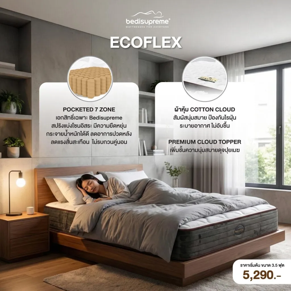 Not everyone is ready to invest tens of thousands of baht in a mattress. The Ecoflex model was designed specifically to address this need. It maintains the essence of a hotel-style mattress with hotel-level quality materials, while being adjusted to a more accessible price point.
