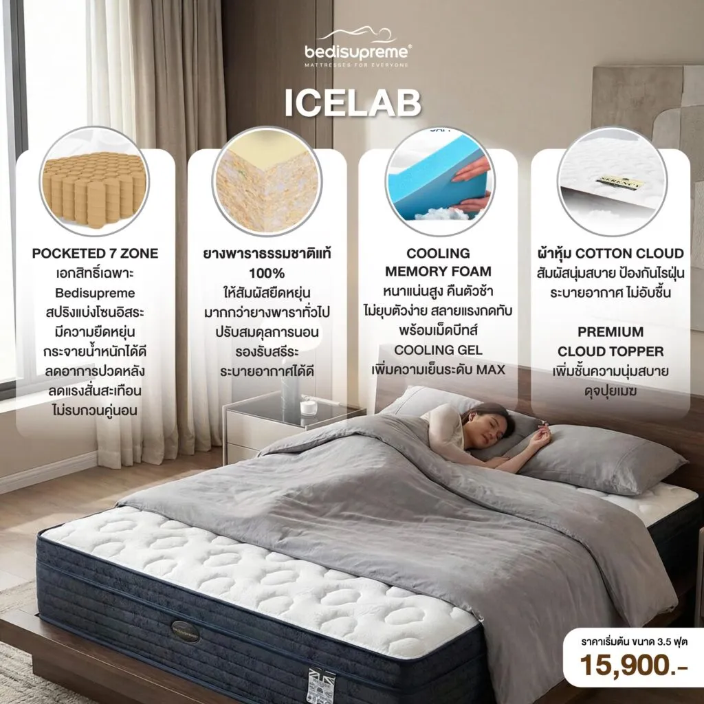 It creates the same luxurious sensation you experience when sleeping on mattresses in leading hotels. The Bedisupreme Serency mattress starts at 11,900 THB for the 3.5-feet size.