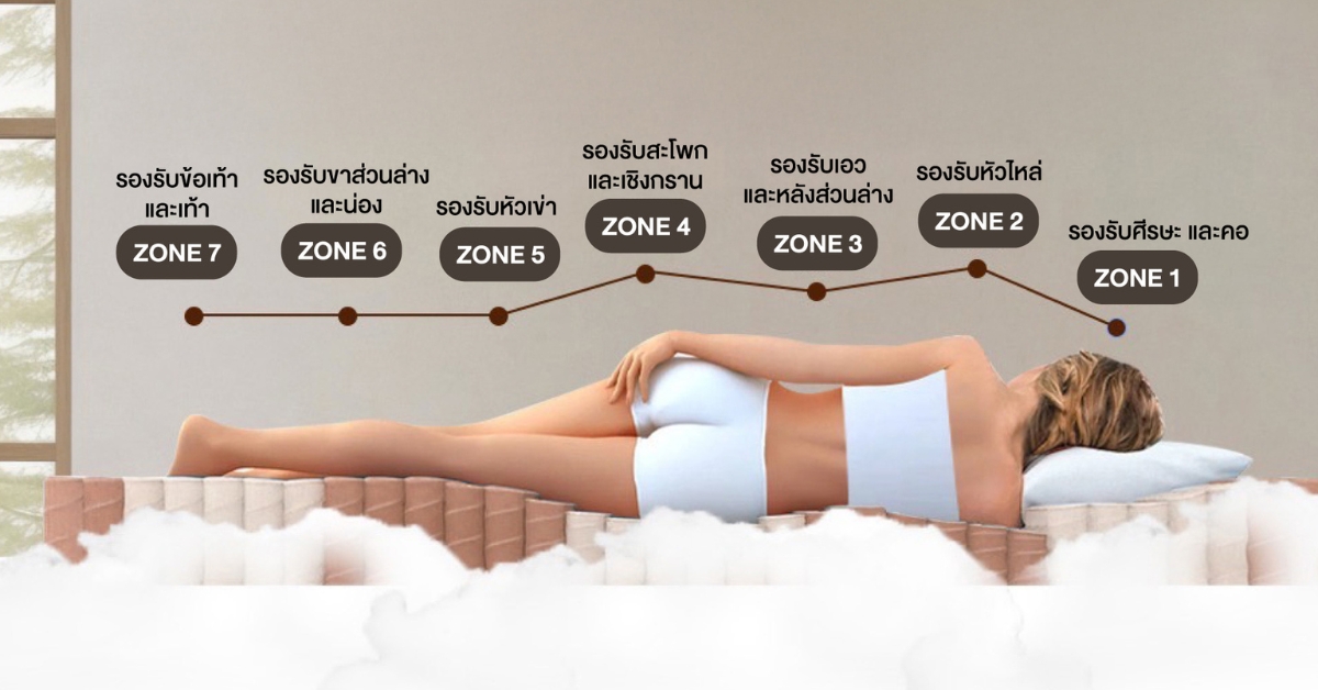 ซึ่งตามหลักสรีรศาสตร์แล้ว ร่างกายต้องการแรงต้านที่แตกต่างกันในแต่ละจุด หากที่นอนนุ่ม หรือแข็งเท่ากันหมดทั้งหลัง จะทำให้กระดูกสันหลังคดงอ และเกิดอาการปวดเมื่อย ระบบ 7 โซนจึงเข้ามาจัดระเบียบให้กระดูกสันหลังอยู่ในแนวเส้นตรง ไม่ว่าคุณจะนอนหงาย หรือนอนตะแคง