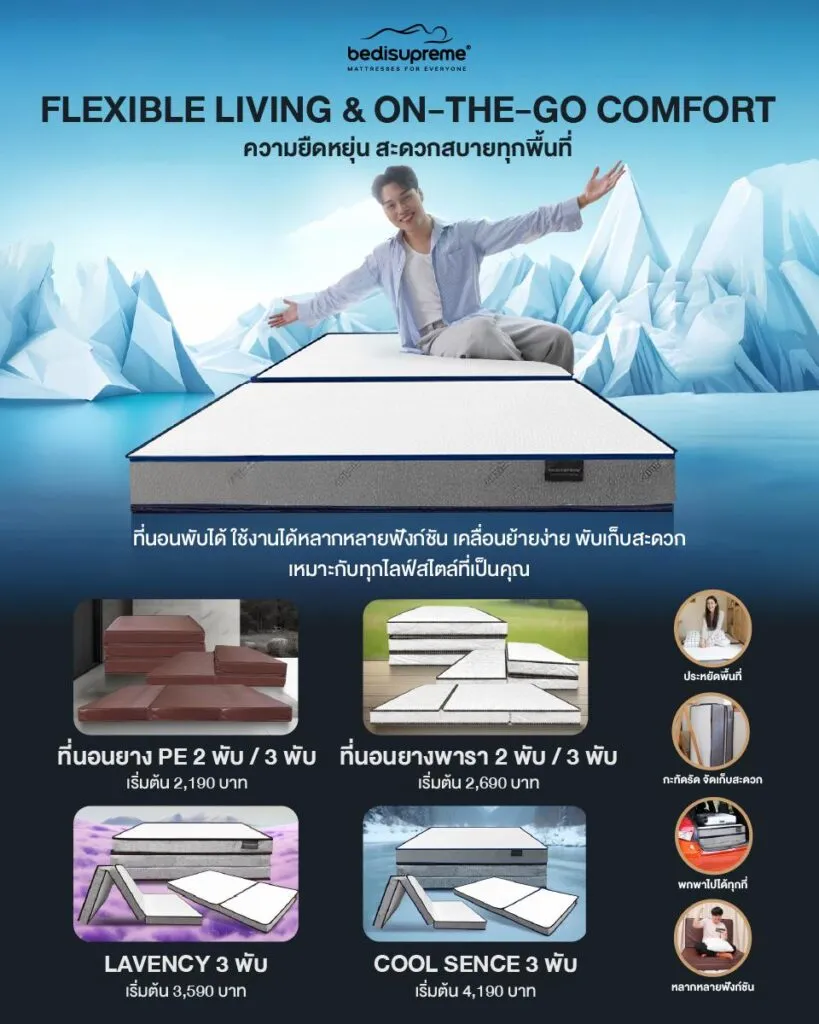 ที่นอนพับได้เป็นนวัตกรรมที่ตอบโจทย์ไลฟ์สไตล์สมัยใหม่ที่ต้องการความยืดหยุ่นและสะดวกสบาย ไม่ว่าคุณจะอาศัยในพื้นที่จำกัด ชอบเดินทาง หรือต้องการความคล่องตัวในการจัดการพื้นที่บ้าน ที่นอนพกพาจาก Bedisupreme มอบทางเลือกที่หลากหลายทั้งในเรื่องของวัสดุ และรูปแบบ ตั้งแต่ยางพาราธรรมชาติ ยาง PE ฟองน้ำออร์แกนิคผสานกลิ่นลาเวนเดอร์ ไปจนถึง Cooling Memory Foam และรูปแบบการพับแบบ 2 พับ และ 3 พับที่เลือกได้ตามความต้องการ