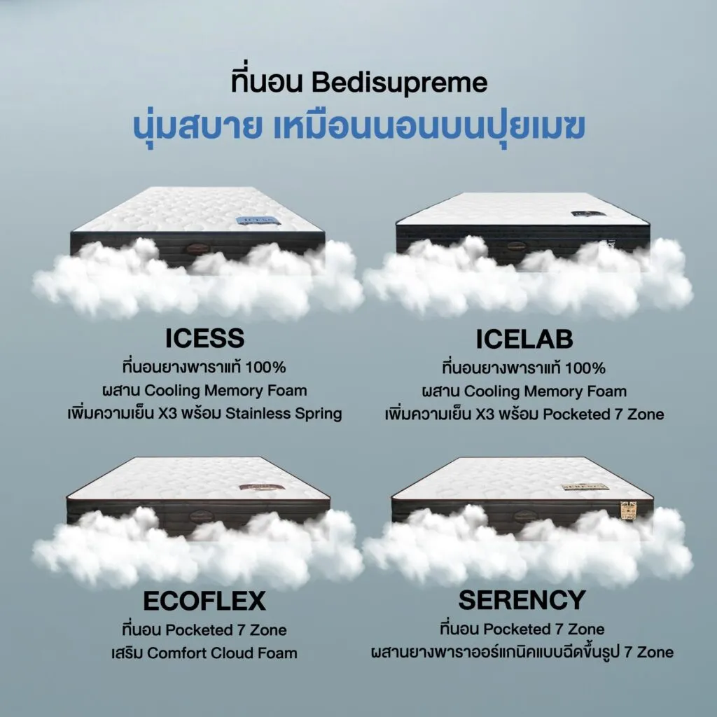Bedisupreme ออกแบบที่นอน SLEEP ON CLOUD หลายรุ่นเพื่อตอบโจทย์ความต้องการที่แตกต่างกัน แต่ทุกรุ่นล้วนผสมผสานเทคโนโลยีวัสดุชั้นนำเข้าไว้ด้วยกัน เพื่อส่งมอบที่นอนคุณภาพสูงที่ตอบโจทย์ทุกไลฟ์สไตล์การนอนอย่างครอบคลุม