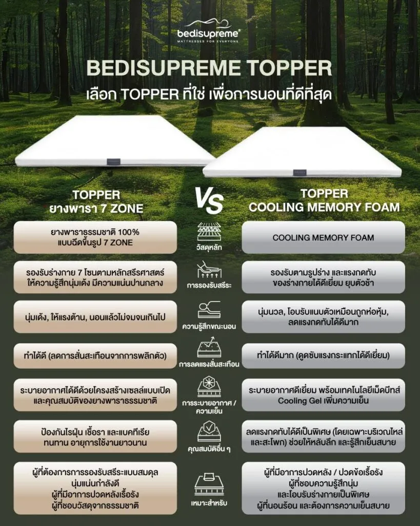 การเลือกซื้อ Topper ที่เหมาะสมกับการนอนของตัวเองนั้นไม่ใช่เรื่องง่าย โดยเฉพาะเมื่อต้องตัดสินใจระหว่าง Topper ยางพารา 7 Zone VS Cooling Memory Foam ที่ต่างก็มีจุดเด่น และคุณสมบัติที่แตกต่างกัน หลายคนมักสับสนว่าควรเลือกแบบไหนดีเพื่อให้ตอบโจทย์การนอนหลับของตนเองมากที่สุด บทความนี้จะพาคุณไปเจาะลึกทุกแง่มุมของ Topper ทั้งสองประเภท เพื่อให้คุณสามารถตัดสินใจเลือกได้อย่างมั่นใจ และเหมาะสมกับความต้องการของตัวเอง
